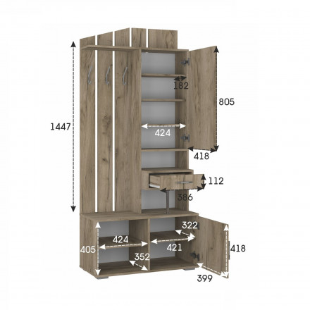| Ориентация | односторонняя; вешалка слева / полки справа |